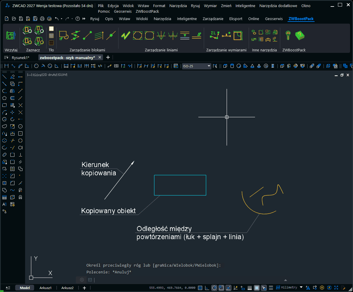W ZWBoostPacku w wersji 2027 (ukaże się wkrótce) między innymi ulepszyliśmy funkcje do kopiowania obiektów. W poprzedniej wersji można było wpisać wartość odległości pomiędzy powtórzeniami lub kliknąć 2 punkty definiujące odległość. W wersji 2027 wprowadziliśmy możliwość wskazania obiektu, z którego będzie pobrana długość, lub kilku obiektów - wtedy ich długość będzie zsumowana. Pokazałem to na filmie poniżej. -