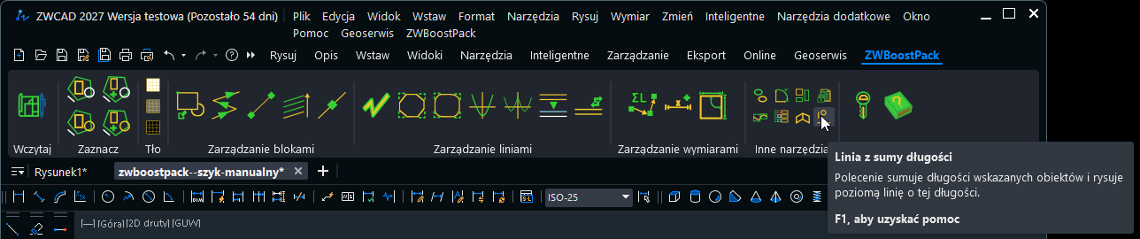 W ZWBoostPack 2027 dodaliśmy funkcje, która rysuje poziomą linię o takiej długości jak wskazane elementy. Możemy zaznaczyć jeden element lub kilka. Następnie wskazujemy początek poziomej linii. Polecenie jest dostępne z menu wstążkowego lub z linii poleceń LiniaZSumyDlugosci . Działanie funkcji pokazałem na filmie poniżej Funkcja może być użyta np. do sprawdzenia wzoru na pole koła Rysujemy koncentryczne okręgi, mierzymy ich długości i rysujemy proste o takiej samej długości jak okręgi. W wyniku tego powstawanie trójkąt prostokątny, gdzie wysokością będzie promień a podstawą obwód koła. -