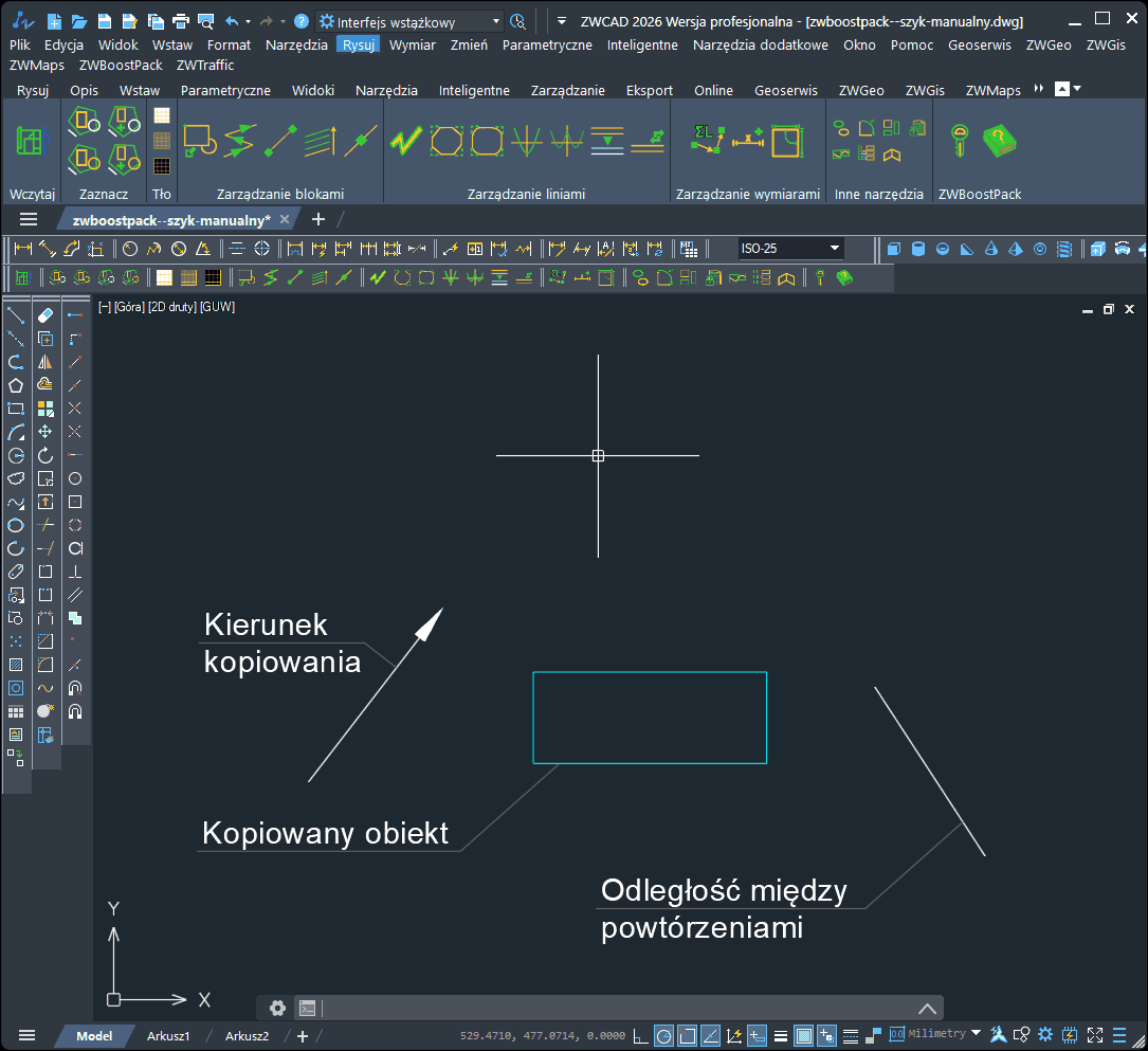 dmatusz3 Opublikowano 14 godzin temu Zgłoś Opublikowano 14 godzin temu W standardowej funkcji do kopiowania określamy punkt bazowy, odległość i kierunek. Jeśli jednak kierunek i odległość nie są powiązane ze sobą to musimy trochę pokombinować, np. jak na tym rysunku poniżej. Polecenie szykmanualny rozwiązuje ten problem. W tym poleceniu: wskazujemy kopiowany obiekt, możemy zmierzyć lub wpisać odległość, definiujemy kierunek kopiowania, naciśnięcie ENTER powoduje wstawienie kolejnej kopii obiektu. Całość operacji pokazałem na filmie poniżej: Mery 1 Cytuj